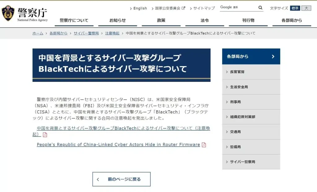 この注意喚起は、米国家安全保障局(NSA)、米連邦捜査局(FBI)、米国土安全保障省サイバーセキュリティインフラ庁(CISA)と共に警視庁と内閣サイバーセキュリティセンターが、中国を背景とするサイバー攻撃グループ「Black Teck(ブラックテック)」のサイバー攻撃に関する合同で発表した注意喚起となっています。